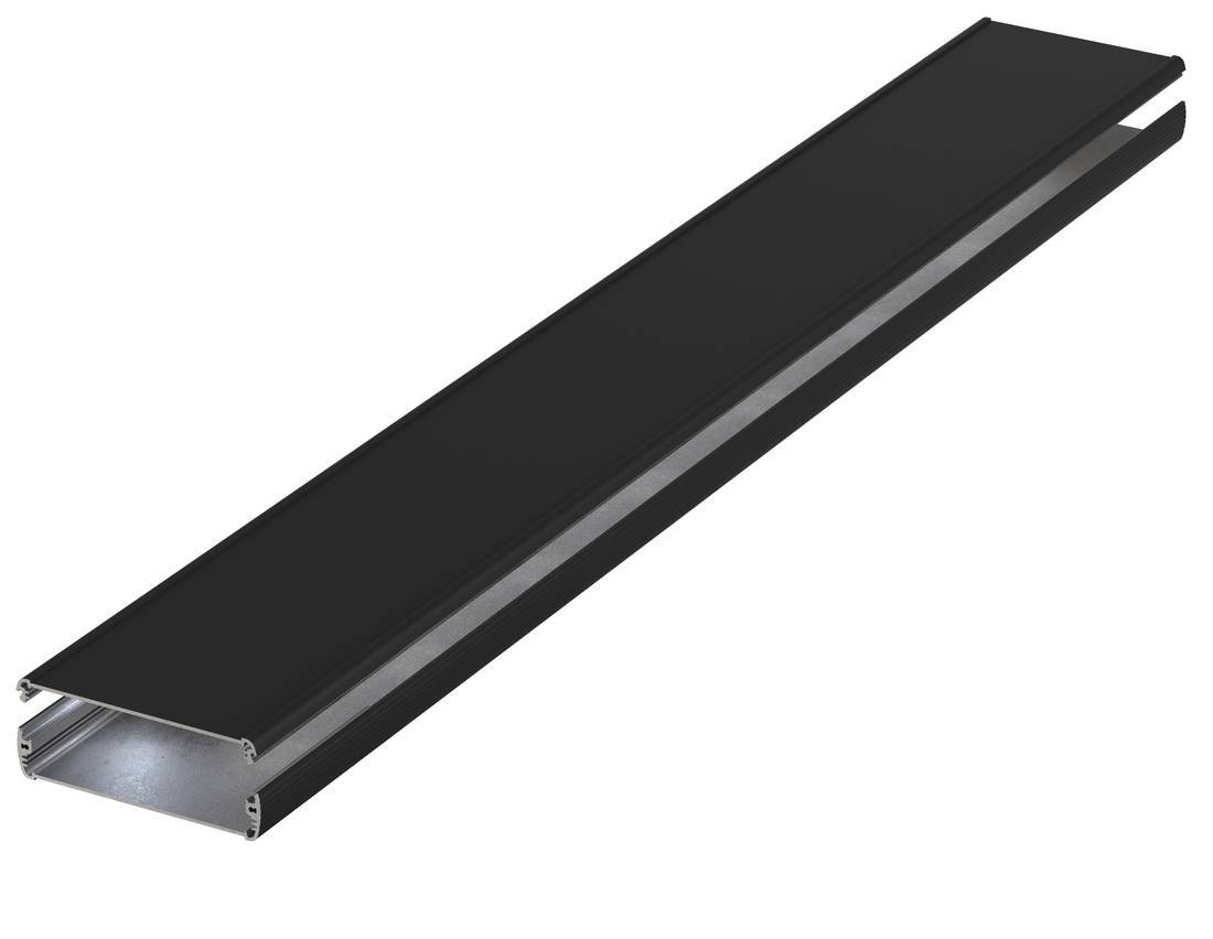 An aluminum profile, horizontally-divided, with profile seal with dimensions of 138 x 34 x 1000 mm, manufactured using the "extruded profiles" technology, featuring multiple guides for PCBs. It is powder-coated in a color similar to RAL 9005. When combined with side covers, it provides an IP65 sealing class. The profile offers the possibility of integrating a radiator. Additionally, other colors, including anodized versions without paint, as well as custom lengths, are available upon special request.