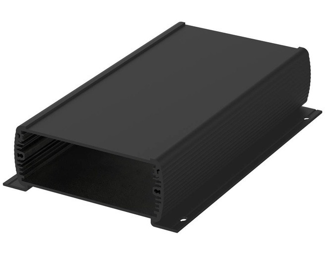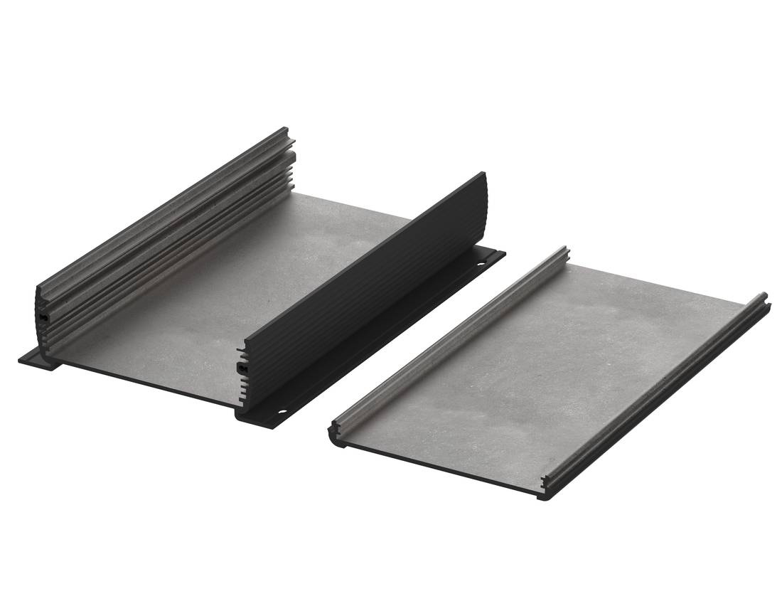 An aluminum profile, horizontally-divided with wall brackets and profile seal with dimensions of 169 x 52 x 100 mm, manufactured using the "extruded profiles" technology, featuring multiple guides for PCBs. It is powder-coated in a color similar to RAL 9005. When combined with side covers, it provides an IP65 sealing class. The profile offers the possibility of integrating a radiator. Additionally, other colors, including anodized versions without paint, as well as custom lengths, are available upon special request.