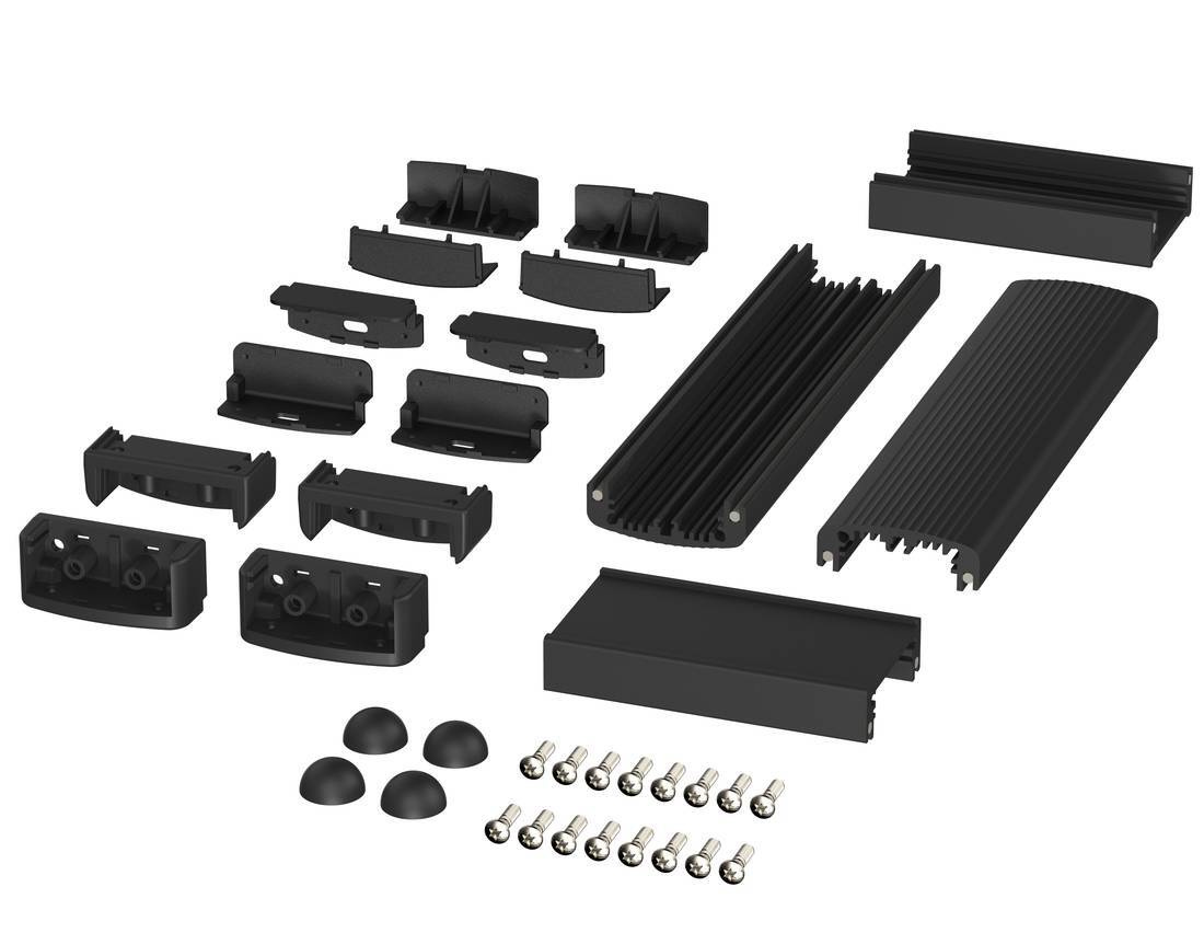 The set includes a complete kit consisting of four powder-coated aluminum profiles with mounted seals, corner connectors, screws, and rubber feet.