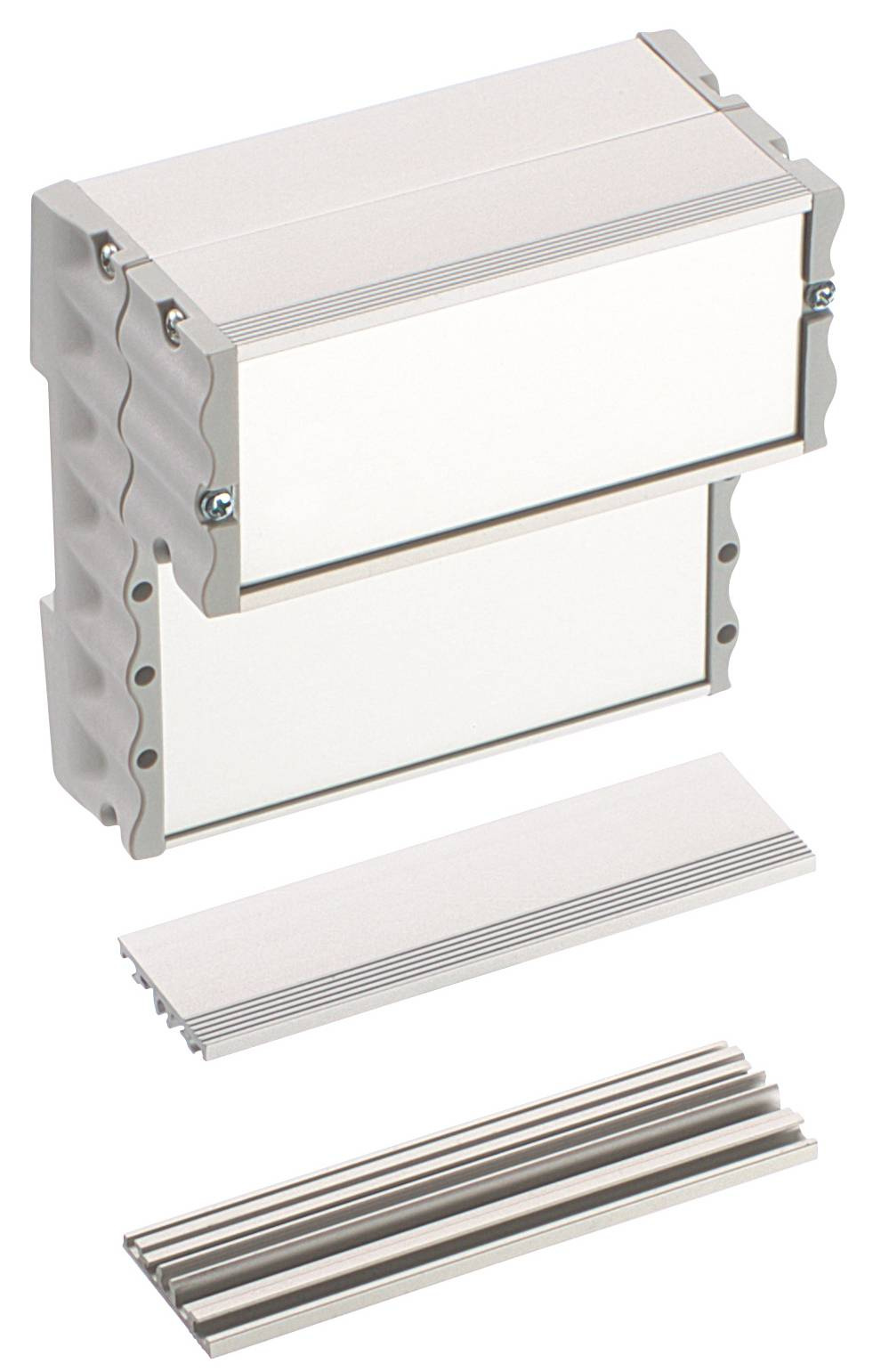 Modular, divided aluminum profiles attached to the base profile (ARP ... 52.5 or ARPG ... 52.5) using plastic or aluminum connectors (AR ... or ARM ...). Front plates (AR ... FP) are fitted to the profile. Assembly of all appropriate parts creates a housing as shown in the illustrative image.