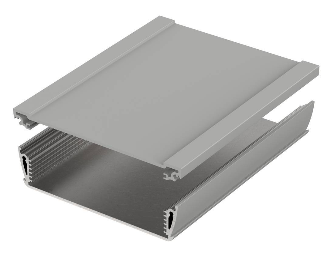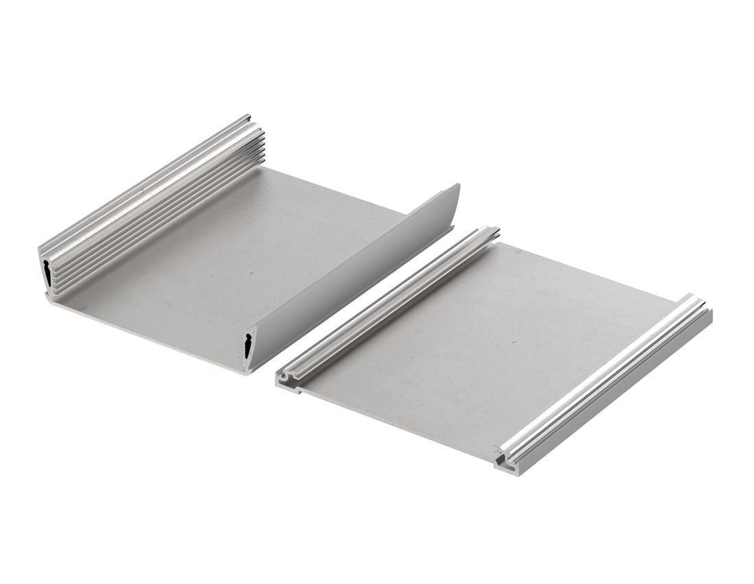 An asymmetrical, semi-open aluminum profile with dimensions of 121 x 32.8 x 150 mm, manufactured using precise "extruded profiles" technology, featuring multiple guides for PCBs. Powder-coated in a colour similar to RAL 9006. When combined with seals (AS-DI or AS-DIS), various side covers (ASD, ASD-AL, ASD-SAL1, ASM-SAL2), and colorful decorative inserts (AS-DS) sold separately, it provides an IP 65 sealing class as well as an elegant design. Option to integrate a heatsink. Other colors, including anodized, unpainted versions, and custom lengths are available upon special request. Wall mounting possible using AS-WL or AS-UWB brackets.