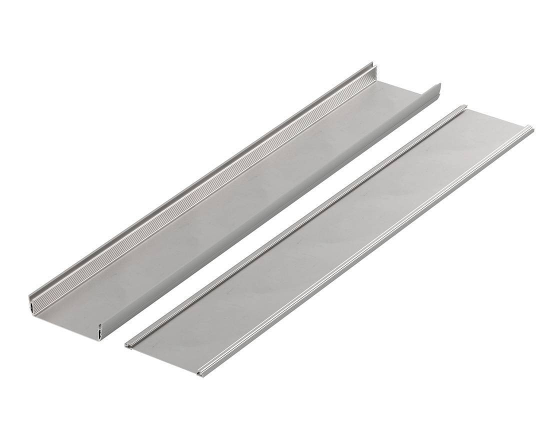 An asymmetrical, semi-open aluminum profile with dimensions of 154 x 44 x 1000 mm, manufactured using precise "extruded profiles" technology, featuring multiple guides for PCBs. Powder-coated in a colour similar to RAL 9006. When combined with seals (AS-DI or AS-DIS), various side covers (ASD, ASD-AL, ASD-SAL1, ASM-SAL2), and colorful decorative inserts (AS-DS) sold separately, it provides an IP 65 sealing class as well as an elegant design. Option to integrate a heatsink. Other colors, including anodized, unpainted versions, and custom lengths are available upon special request. Wall mounting possible using AS-WL or AS-UWB brackets.