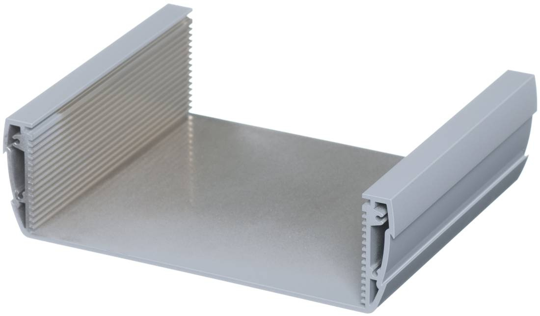 Asymmetric aluminum profile, open, with dimensions of 187 x 54.6 x 200 mm, precision-manufactured using extruded profiles technology, featuring multiple guides for PCBs. Powder-coated in a color similar to RAL 9006. When combined with seals (AS-DI or AS-DIS), various side covers (ASD, ASD-AL., ASD-SAL1, ASM-SAL2), and colorful decorative inserts (AS-DS) sold separately, it provides an IP 40 protection class and an elegant design. Possibility of integrating a radiator. Other colors, including anodized, unpainted versions, and custom-cut lengths, available upon special order. Wall mounting via AS-WL or AS-UWB brackets. Front panels tailored to the enclosure available separately as ASPU.
