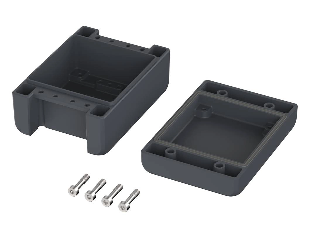 The modern industrial aluminum enclosure features a design that simultaneously maintains high protection standards. Secured with screws. A precisely fitted neoprene gasket ensures a high IP protection rating according to DIN EN 60529. It meets the requirements of the railway standard DIN EN 45545-2 regarding the emission of harmful substances during the combustion of the coating. It achieves an impact protection rating of IK07, 08 according to IEC 62262. In terms of shape, the aluminum Bocube Alu enclosure line corresponds with the Bocube plastic enclosures, allowing for a consistent marketing appearance of devices. Colors other than those listed in the catalog are available upon request, including unpainted enclosures. The set includes the top and bottom of the enclosure with mounting screws.