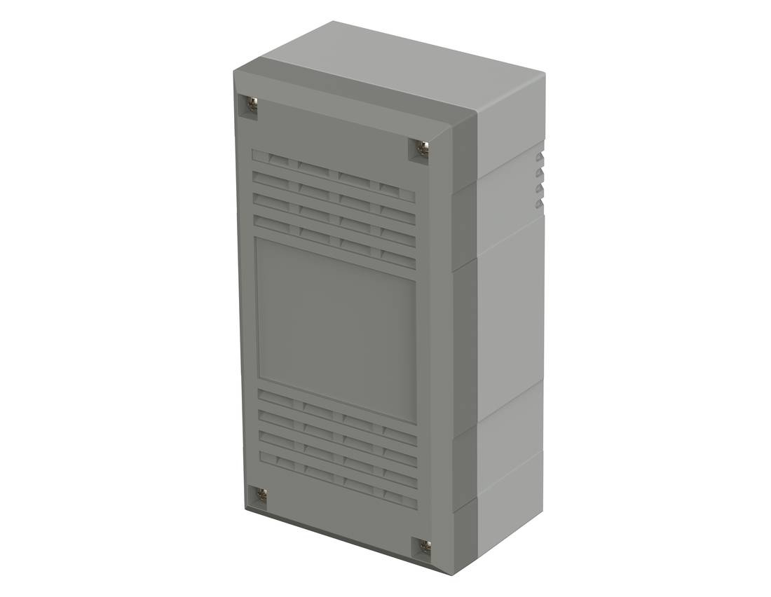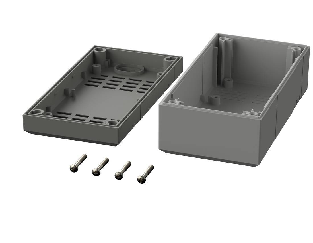 Screwed enclsoure with air vents in the lid and base. Lid in light gray RAL 7035 color and base in dark gray RAL 7038 color. Screws not visible from the front of the enclosure.