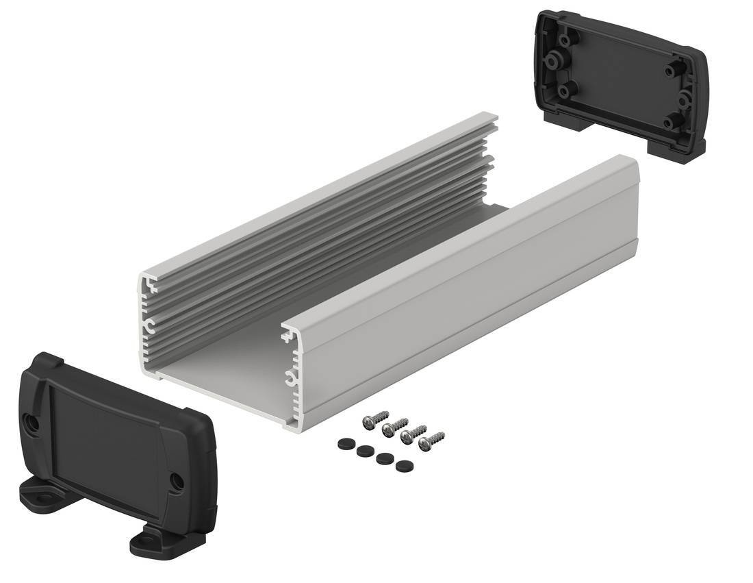 Anodized open aluminum profile with dimensions of 80 x 42 x 200 mm, made using the "extruded profiles" technology, with guides for PCB boards. When combined with separate plastic lids and aluminum front panels, it provides an IP40 sealing class according to DIN EN 60529. The plastic covers have external recesses for flush-mounted keyboard assembly, while internally they have pins for securing the PCB. It is possible to integrate a radiator.
