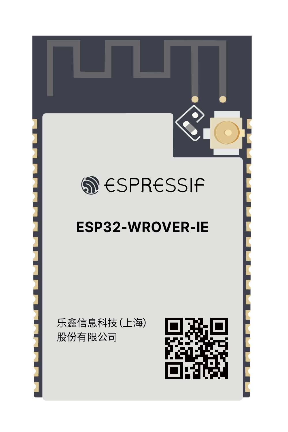 A module designed by Espressif Systems, with an ESP32-D0WDR2-V3 MCU embedded, supporting WiFi 802.11 b/g/n, 2.4 GHz standards as well as Bluetooth 4.2. The product has 24 configurable pins (GPIO) and an IPEX antenna.