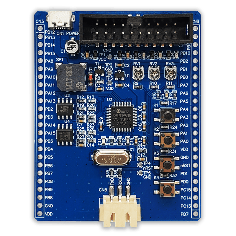 Mini-SPIN0280 is a development kit from MindMotion, consisting of a MiniBoard and a high-performance 32-bit MM32SPIN0280D6P microcontroller with built-in high-speed memory, a wide range of extended I/O ports and peripherals.