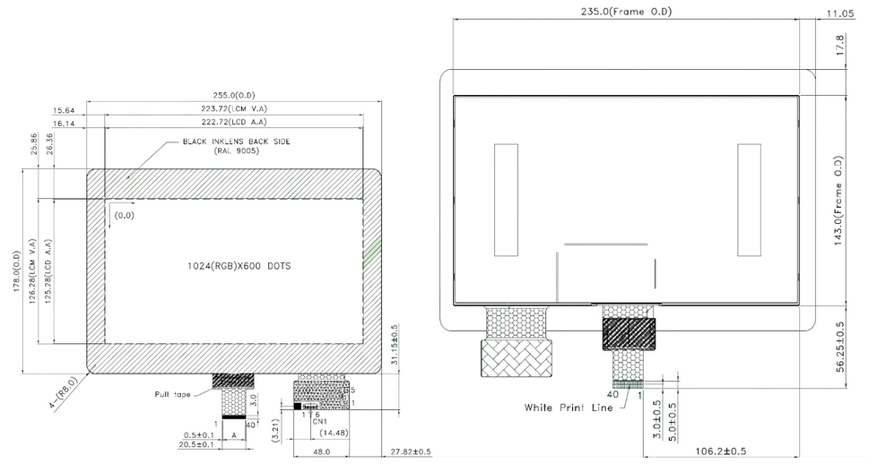 A 10.1" TFT full-view display, created by Powertip. The display has a 1024 x 600 WSVGA resolution and a LVDS interface. Brightness: 500. Operating temperature range -20...+70°C.