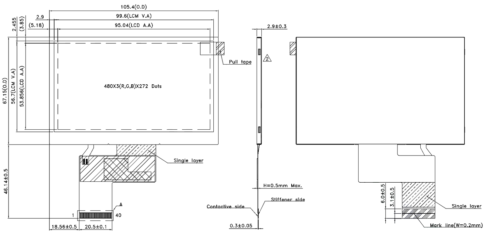 TFT full-view 4.3" display with 24-bit RGB interface, 480 x 272 WQVGA resolution. Brightness: 400, ST7282A controller. Operating temperature range -20...+70°C.