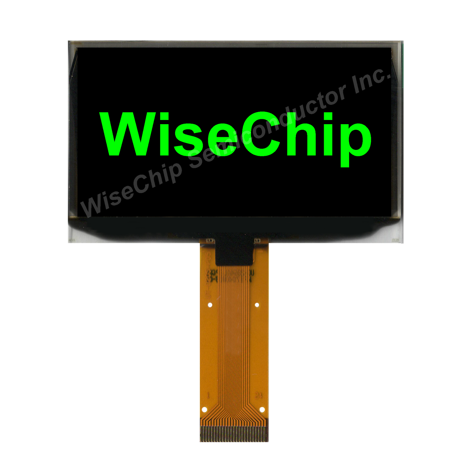 Monochrome OLED display, designed by WiseChip Semiconductor Inc. Green color.