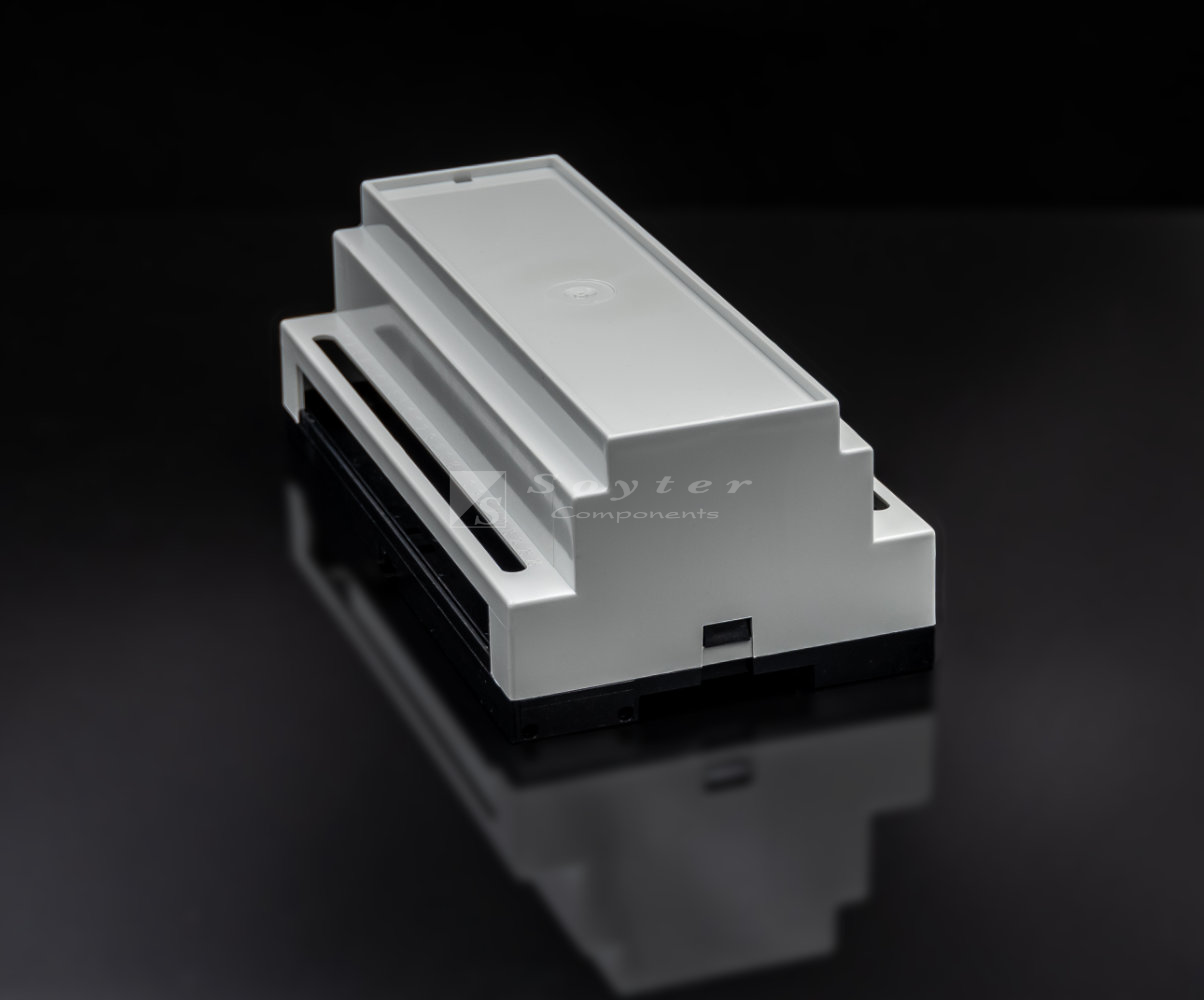 W zestawie dostarczamy kompletną obudowę składającą się z pokrywy w kolorze szarym i podstawy w kolorze czarnym wraz z uchwytem do montażu na szynie DIN oraz śrubkami. Uchwyt do montażu na ścianie oferowany jest osobno.
