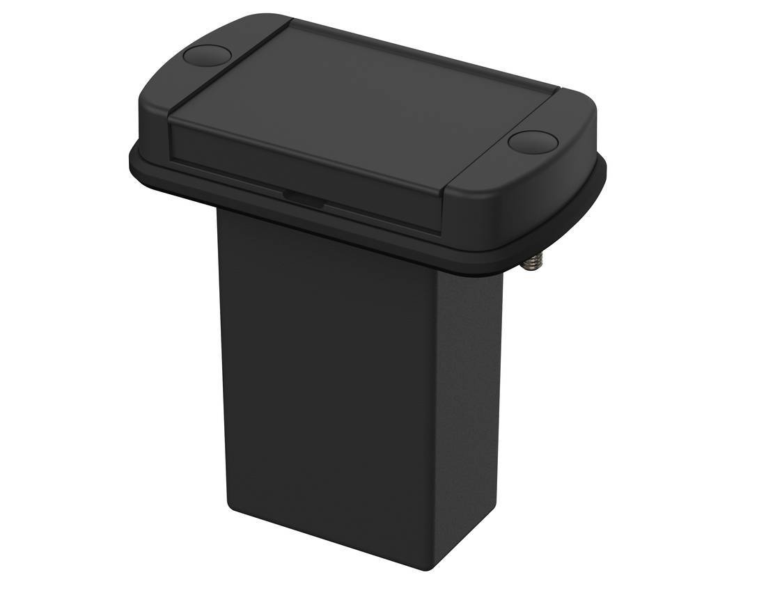 Zastosowanie: pokrywa boczna z zintegrowanym pojemnikiem na baterie 9V i aluminiową klapką na zawiasach , pod którą można wyfrezować wejścia złącz. Zapewnia zamknięcie i uszczelnienie obudowy AB 600.