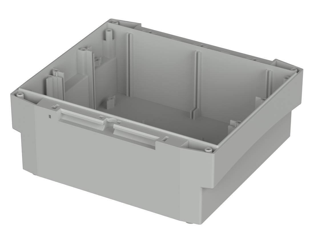 Podstawa designerskiej przemysłowej obudowy Bocard z możliwością łączenia z różnymi wariantami pokryw w zależności od wymagań projektu. Rozbudowany zestaw akcesoriów do przenoszenia i montażu na ścianie, dopasowane do podstawy obudowy płyty montażowe i szyny TH, elementy plastikowe separujące podstawę na część elektroniczną i elektryczną w wersji KRD dostępnej na zapytanie, liczne prowadnice i kołki do montażu PCB, możliwość wykonania w materiale spełniającym wymogi UL 94 V0.
