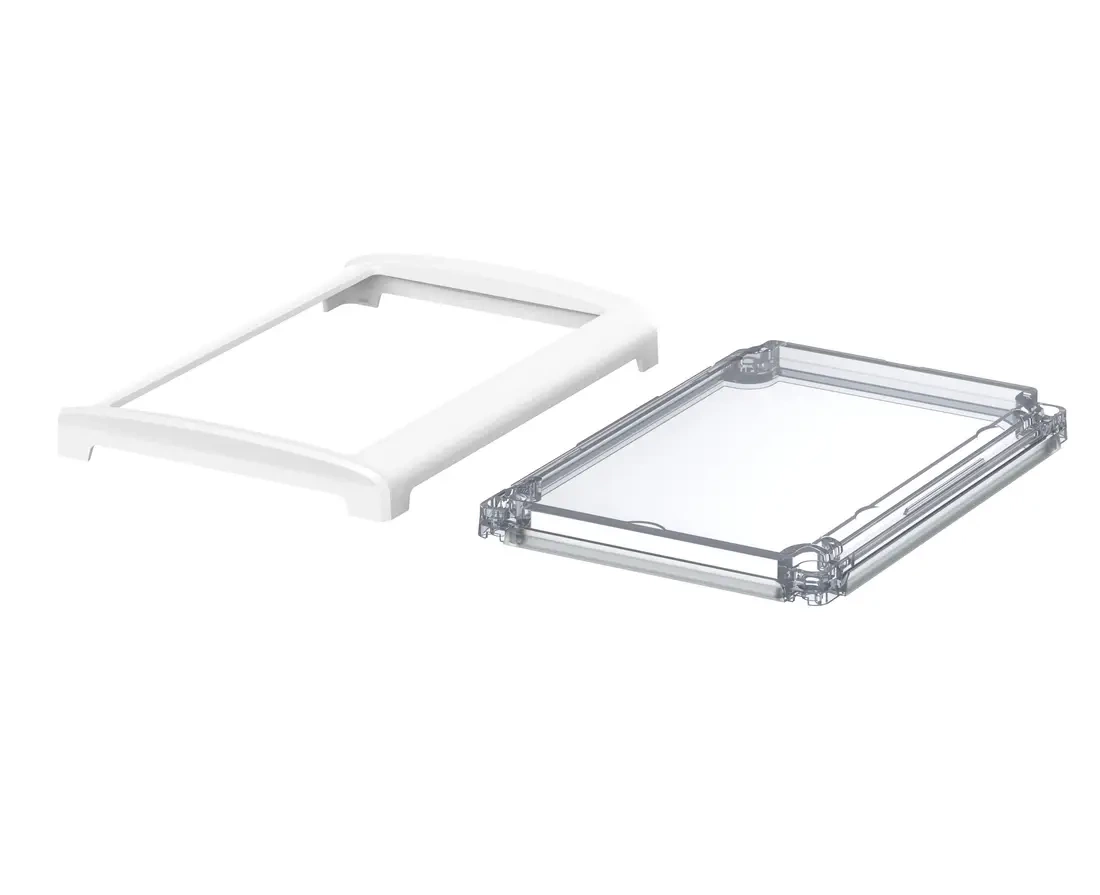 Przezroczysta plastikowa pokrywa BoVersa typu transparent z otwartym białym design coverem z uszczelką silikonową do obudów BOV 171204.- Certyfikat kolejowy (EN-45545-2) pokrywy