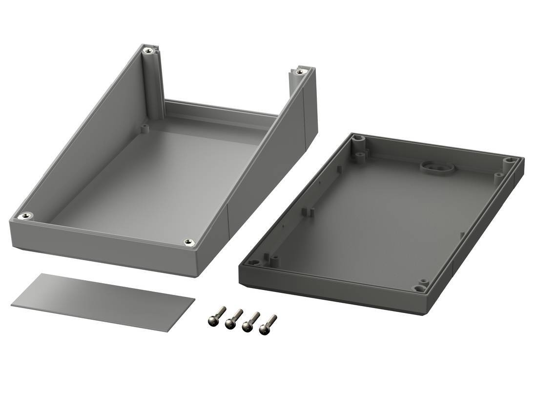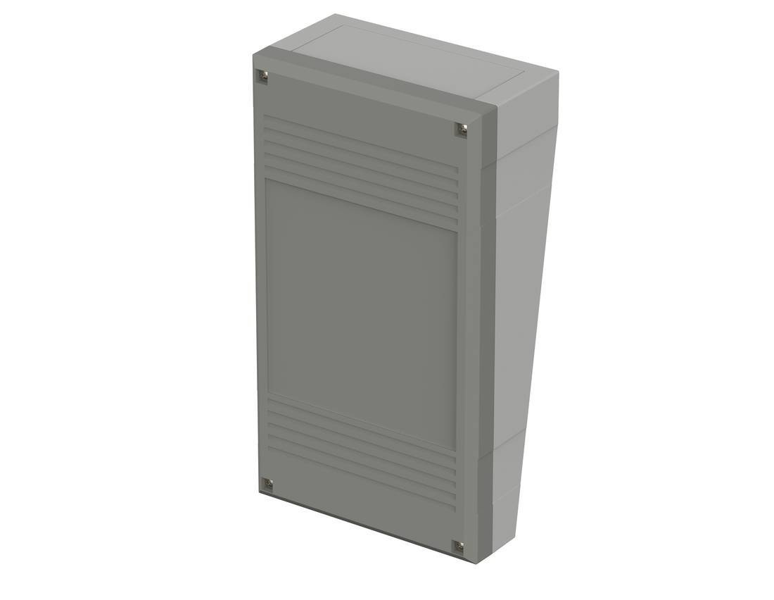 Obudowa pulpitowa ze zdejmowanym tylnym frontem ułatwiającym montaż. Pokrywa w kolorze jasnoszarym RAL 7038 posiada wgłębienie o głębokości 1mm i umożliwia licujący montaż klawiatur membranowych. Podstawa jest w kolorze agatowoszarym RAL 7035.