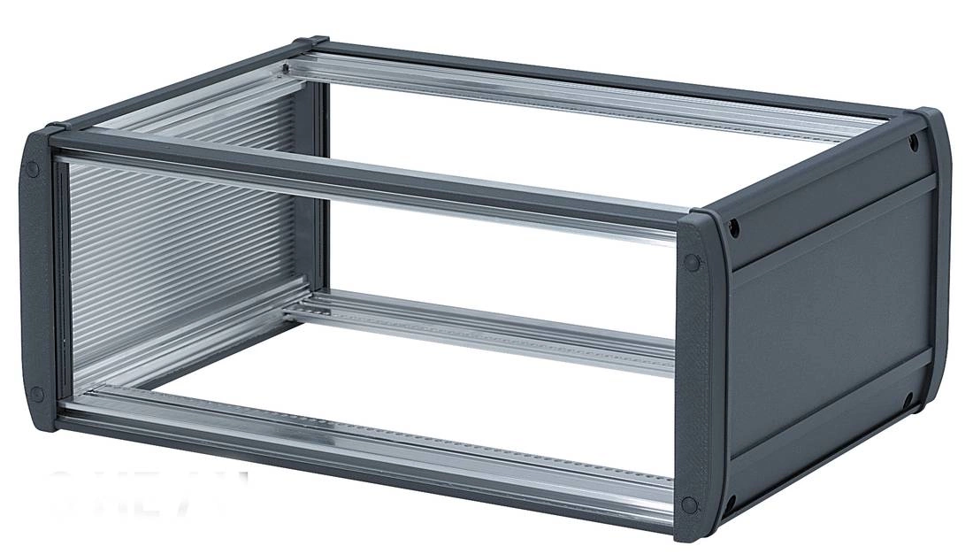 Precyzyjnie wykonany wysokojakościowy profil bazowy w eleganckim design obudowy desktopowej spełniającej wymogi mechaniki 19 calowej i ochrony EMC. W celu złożenia obudowy według indywidualnych potrzeb należy dobrać odpowiednie akcesoria jak panele przednie, górne, dolne, elementy dekoracyjne, ramki do montażu kart PCB, nóżki, uchwyty naścienne, akcesoria EMC, prowadnice do kart PCB, szyny montażowe i inne. W oferowanym zestawie dostarczamy 2 profile, 4 narożniki, 4 elementy dekoracyjne w kolorze ciemnoszarym oraz materiały montażowe. Profile i narożniki łączeniowe zostały wykonane z aluminium, uszczelnienie w materiale TPE. Możliwość pomalowania na inny kolor niż katalogowy oraz dobrania innych długości i szerokości profili na specjalne zamówienie.