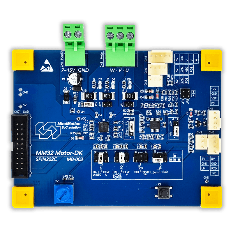 Motor-DK-SPIN222C to zestaw rozwojowy firmy MindMotion, złożony z płyty Motor-DK i 32-bitowego, wysoko wydajnego mikrokontrolera MM32SPIN222C z wbudowaną szybką pamięcią, szeroką gamą rozszerzonych portów I/O i urządzeń peryferyjnych.