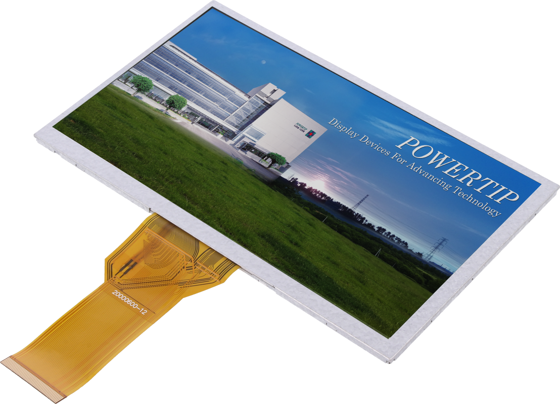Wyświetlacz TFT marki Powertip o rozdzielczości 800 x 480 WVGA, przekątnej 7", z 24-bitowym interfejsem RGB. Jasność: 900. Zakres temperatury pracy -20...+70°C.