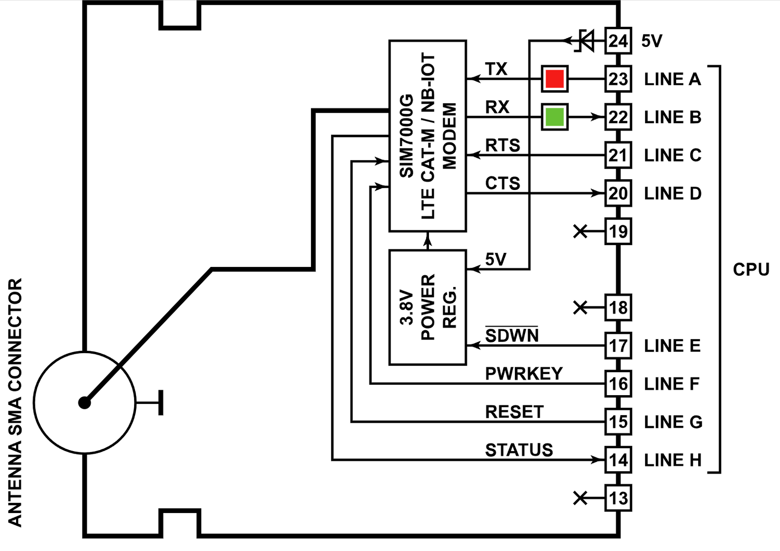 Tibbit Block #46 to modem Cat-M1 i NB-IoT. Do działania niezbędna jest antena zewnętrzna. Jego forma to H2 (M2+C2), o wymiarze 14x20 kwadratów (2,54 x 2,54 mm każdy).